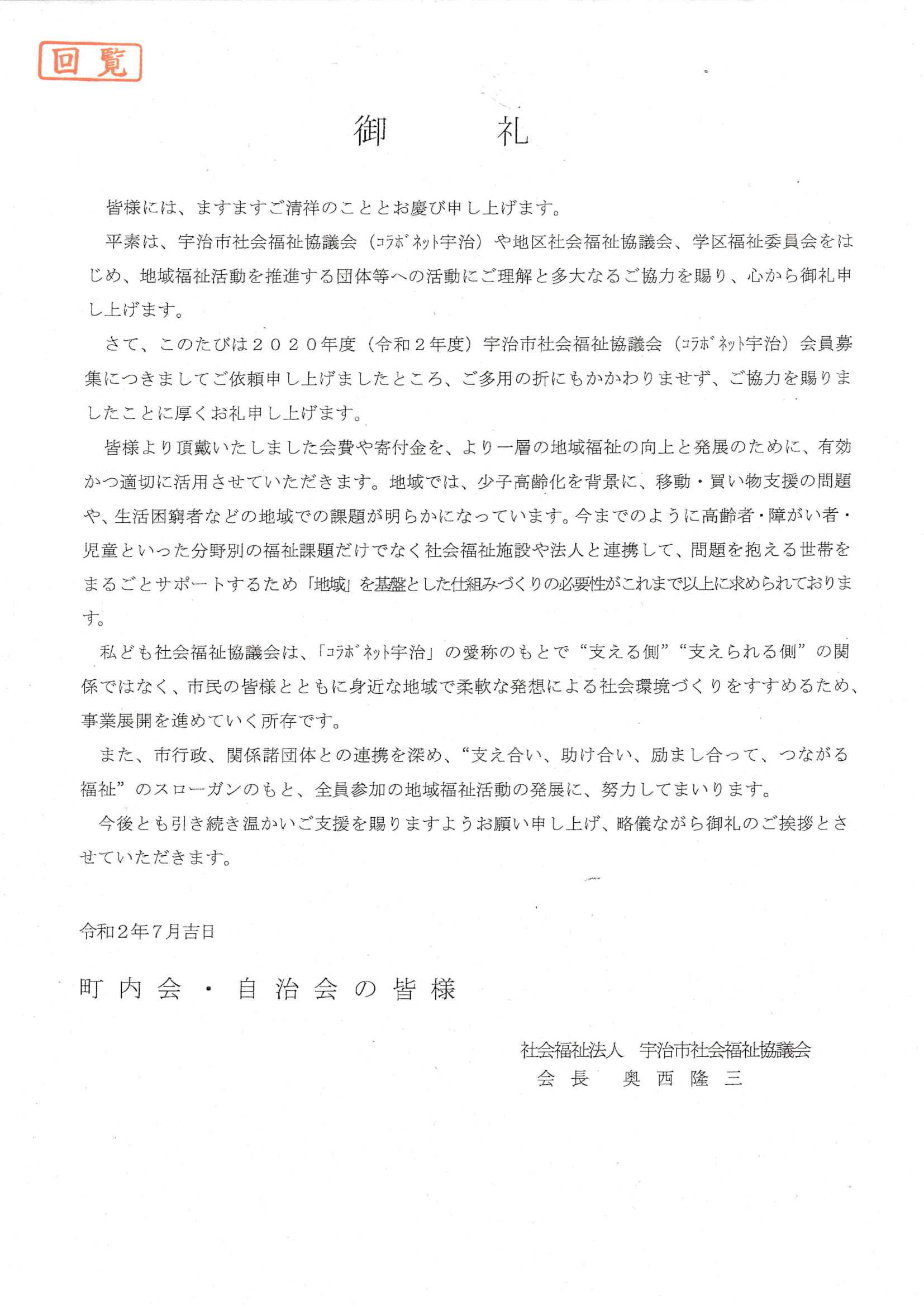 宇治市社会福祉協議会からのお礼状 2020年9月