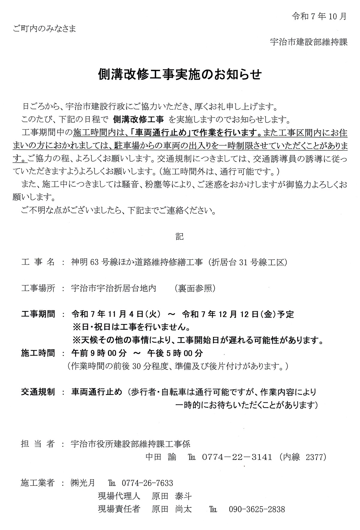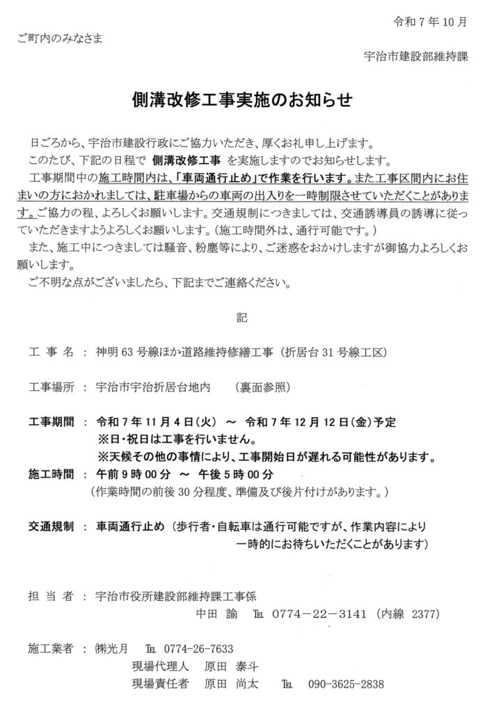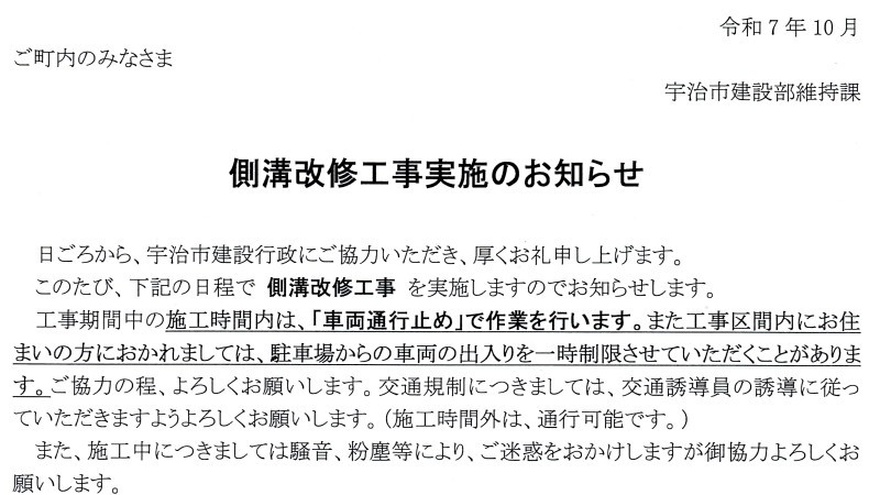 側溝改修工事実施のお知らせ 2025年11月04日~12月12日