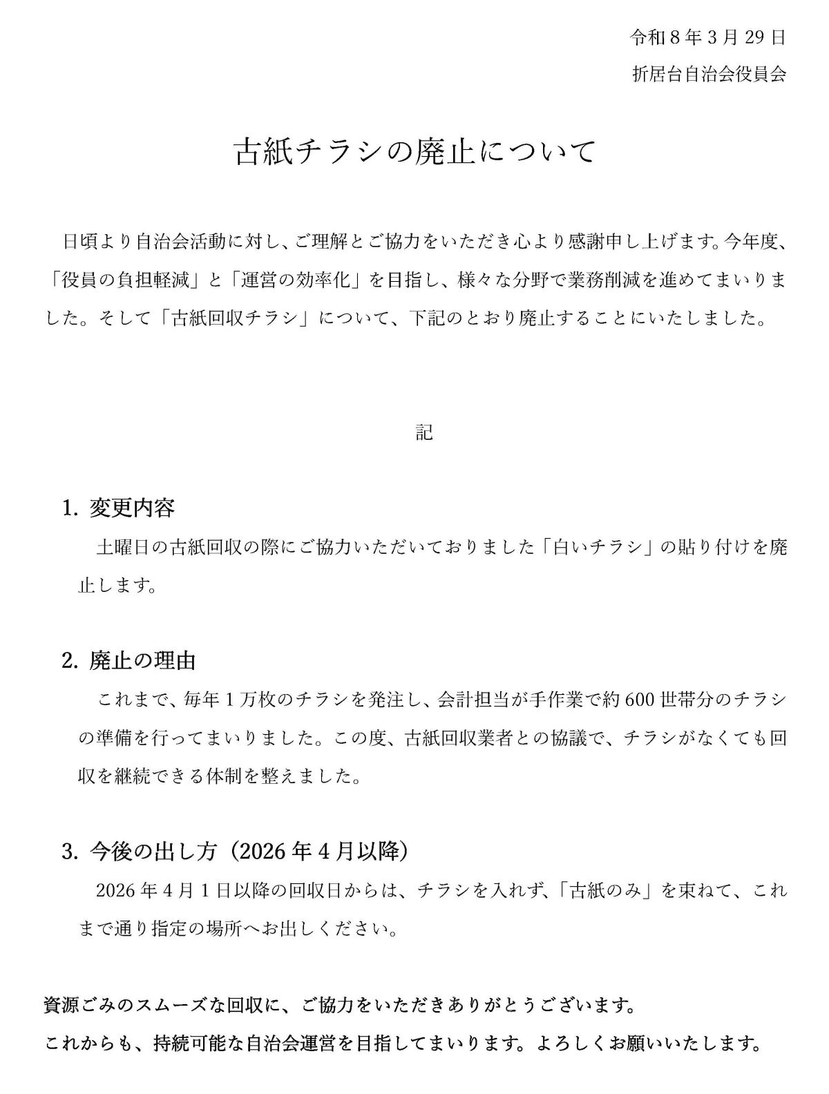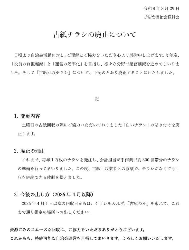 古紙回収チラシの廃止について 2026年3月29日