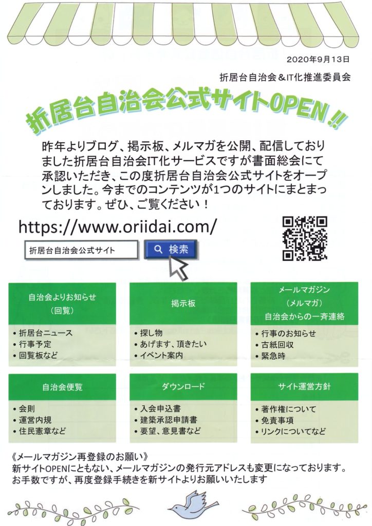 2020年9月13日 折居台自治会公式サイトOPEN!! X Facebook はてブ LINE コピー 2020.09.132022.09.19 昨年より、掲示板、メルマガを公開、配信しておりました折居台自治会IT化サービスですが、書面総会にて承認していただき、この度、折居台自治会公式サイトをオープンしました。今までのコンテンツが1つのサイトにまとまっております。ぜひ、ご覧ください。